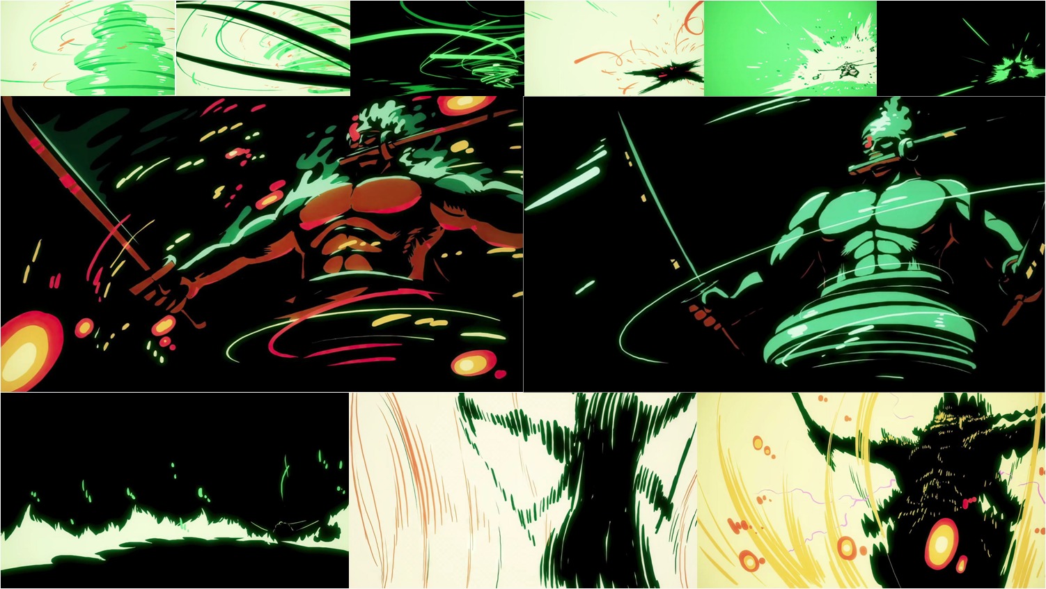 את האנימציה של המכה באוויר שמרימה את זורו מבצע, שוב, כריס, וגם שוב, עם תיקוני איור אינטנסיביים במיוחד מאישיזוקה – מה שנותן לה את התחושה העוצמתית הנחוצה לרגע עם משמעות סמלית כה חשובה. אנחנו מייד עוברים משם לאנימציה של הירומי אישיגאמי (Hiromi Ishigami), אנימטור שעבד על הקרב הסופי של נארוטו וסאסקה בסוף נארוטו שיפודן, אשר מבצע את מעופו של זורו לעבר אדמת אוניגאשימה, יחד עם הנחיתה, ופוזת הניצחון השלישית. אישיגאמי מפוצץ את הקטע שלו באנימציית רקע מטורפת לאוניגאשימה, אשר מציגה באופן מרשים וחזק את מעופו של זורו לאדמתה, ומצייר עבורו נחיתה אגרסיבית ועוצמתית המתאימה לסגנון הלחימה של הסייף המדהים.