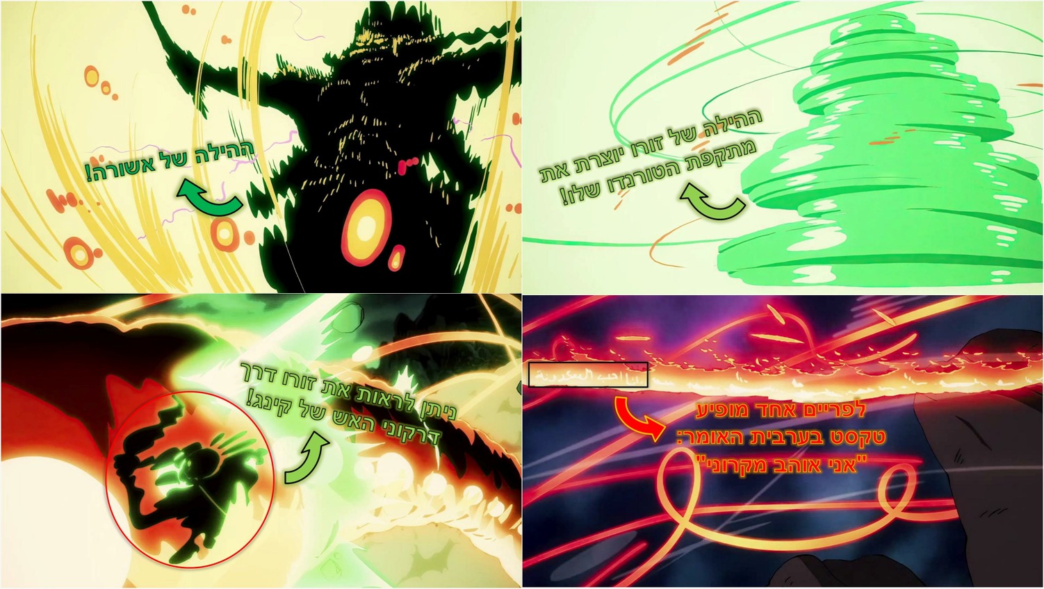 מעניין אותי מי קלט את זה… אם בכלל XD . פרט מעניין נוסף שקלטתי הוא המשחק עם צבעי הלהבות של קינג: כשהוא זז ונלחם, הן מתחממות – ונהיות צהובות, וכשהוא עומד לרגע בלי לעשות כלום – הן נצבעות באדום, צבען של הלהבות הקרות ביותר (יחסית). תשומת הלב לפרטים בפרק הזה היא באמת מטורפת.