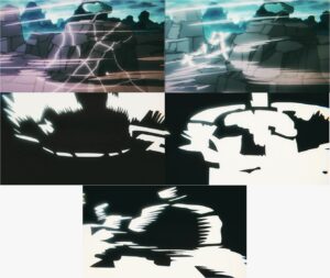 את המתקפה עצמה, עם זאת, מבצע האיאטו קורוסקי (Hayato Kurosaki), והוא ממלא אותה באפקטים מאוד יפים – דבר לא מפתיע, בהתחשב בעבודתו על השמדת הבית של אקי, הסצנה ההיא של מאקימה בפרק 9, הפתיח, וקטעים נוספים בצ'יינסו מן.
