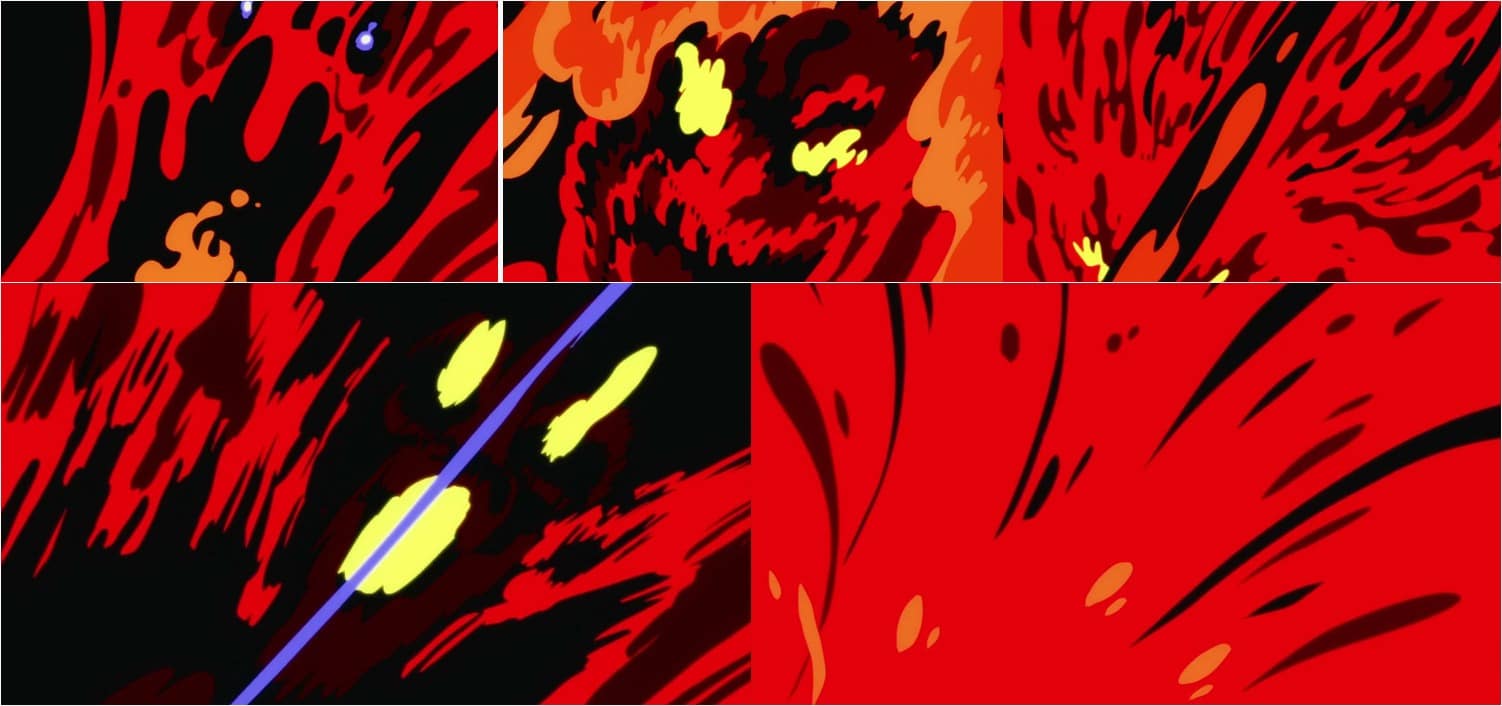 בהשוואה של תמונה ליד תמונה, אין ספק שהפאנל של המנגה נראה טוב יותר. עם זאת, אנימציה נועדה להיצרך בתנועה ולא כתמונות בודדות (זאת בדיוק הסיבה שבגללה לעצור אנימציה על פריים מעוות ולצחוק שזו אנימציה רעה זה דבר לא נכון ומביך שאנשים צריכים להפסיק לעשות), וכאשר מתחשבים בכול האלמנטים אשר זזים במקביל בשוט הזה, הוא מאוד מרשים. בחזית התמונה יש לנו את לואו, את המעיל שלו שנע בנפרד ממנו, את שני חצאיה של מיזרי, ועוד אפקטים פה ושם של חלקים קטנים ממנה שעפים מסביב. ברקע, יש לו את קיד, את הלייזר שלו, את ביג מאם, את האדמה שנשברת תחת הלחץ של המתקפה של קיד שדוחפת אותה מטה, ואת האפקטים של הברקים הסגולים מהכוח של קיד. נוסף על כל אלה, יש את הסופר-רקע – מושג המתאר את הרקע המרוחק, במקרה זה המבנים שמאחורי קיד. כל אלה מצויירים פה בפירוט גבוה, וכולם גם זזים בהתאמה ובמקביל – שזה מאוד מרשים, במיוחד כי התזמון המדוייק של הקטע מונע ממנו להפוך למתקפה על העיניים שלנו. מה שקורה על המסך הוא מאוד ברור, ששוב, זה מרשים בהתחשב באלמנטים הרבים שזזים במקביל.