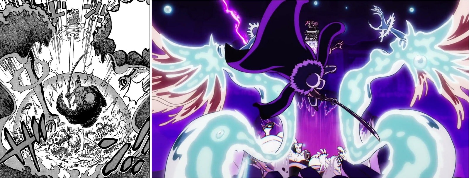 הפריים השני עלול להיות עוד רפרנס ל… אתם יודעים מה (ואם אתם לא, טוב שכך), והבחירה בהילה ירוקה עבור לופי היא מאוד מוזרה, אבל עובדת פה טוב לדעתי. בנוסף, קאידו מצוייר בצורה סופר יפה ומאיימת לאורך כל הקטע הזה (ווינסנט הוא בכללי האדם שעושה את קאידו הכי טוב באנימה בפער), והפריים הרביעי פה הוא דוגמה מצויינת לכך.