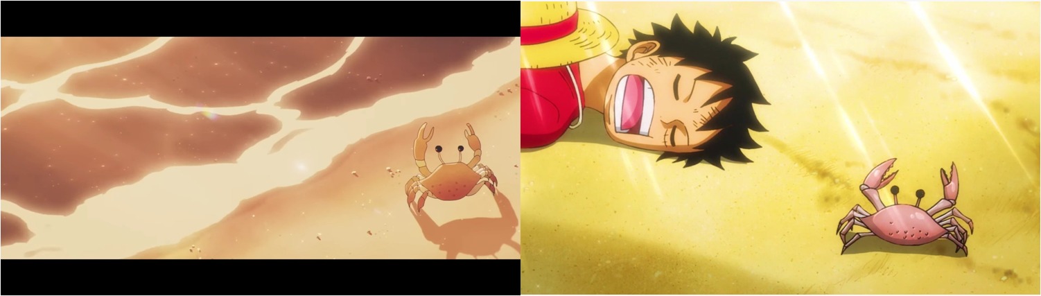 הסגיר נפתח עם שוט של סרטן הולך על חוף הים, מה שנעשה ברפרנס מאוד ברור (לפחות אם זוכרים את הסצנה הזאת, ואין לי מושג למה אני זוכר אותה) לסצנה הראשונה של לופי על אדמת וואנו מסוף פרק 892 – ובה סרטן הולך על החוף, מגיע ללופי, וצובט אותו באף. רפרנס מגניב בטירוף בעיני.