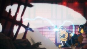קווין משתמש ב"נצנוץ קווין", החיקוי שלו לטכניקה של איצ'יג'י, ואנחנו מקבלים סצנת אקשן קצרה ונחמדה מאוד של המתקפה. התנועה של קווין בעודו "בונה" את המתקפה היא יפה ונחמדה, השימוש במספר אימפקט פריימס (impact frames, מושג מאנימציה שמתאר פריימים מופשטים שמטרתם להעביר לצופה את תחושת העוצמה של [לרוב] מתקפה) עוזר למכור את העוצמה של המתקפה, והשוט של סאנג'י מתחמק מהלייזרים מוצג מזווית "צילום" מאוד דינמית ומעניינת לעין – דברים שביחד משתלבים ליצירת קטע קצר ומגניב.