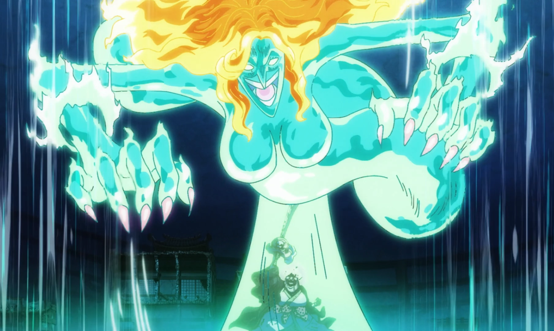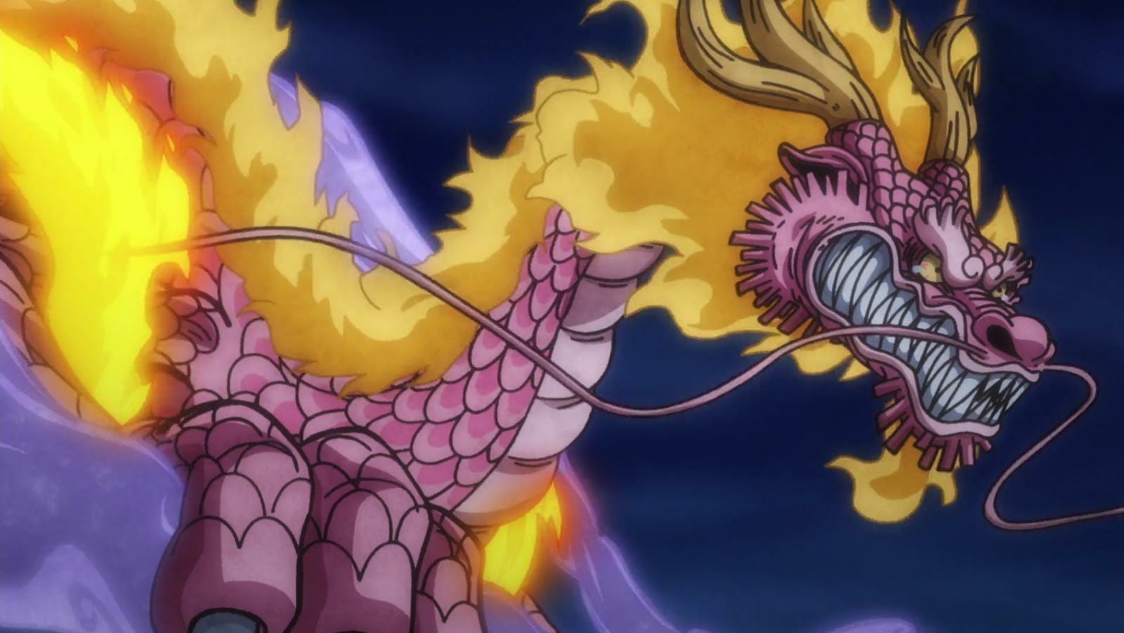 אנחנו חוזרים למומו, הנאבק למשוך את האי, ואז חותכים לרגע קצר של אקשן בין לופי וקאידו – אקשן אשר הנרי אמר כי הוא הכניס לפרק בכוונה רק כדי שהוא יוכל סוף-סוף לעשות אנימציה על הקרב ביניהם. הסצנה הקצרה הזו של הקרב הייתה ממש מגניבה, עם אנימציה מצויינת של הנרי והצגה ממש מגניבה של הדם שניתז על האדמה סביבם. בנוסף, הקטע האחרון שבו קאידו הופך לצל מפלצתי נראה מדהים, וגם כלל אנימציית רקע מטורפת לחלק שבו המצלמה מקיפה אותם ברבע סיבוב כזה ומתרחקת החוצה.