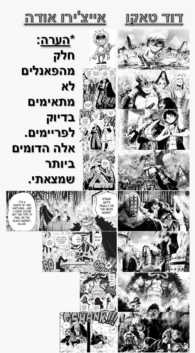 להלן מצורפת השוואה שהכנתי בין הציורים של טאקו לפאנלים של אודה שעליהם הם מתבססים – שימו לב להערה החשובה שכתובה שם – ובהמשך להערה הנ"ל, במידה ואתם חושבים על פאנל מהמנגה שיותר מזכיר את אחד מהציורים האלה, אשמח לדעת. אלה הקרובים ביותר שאני הצלחתי למצוא.