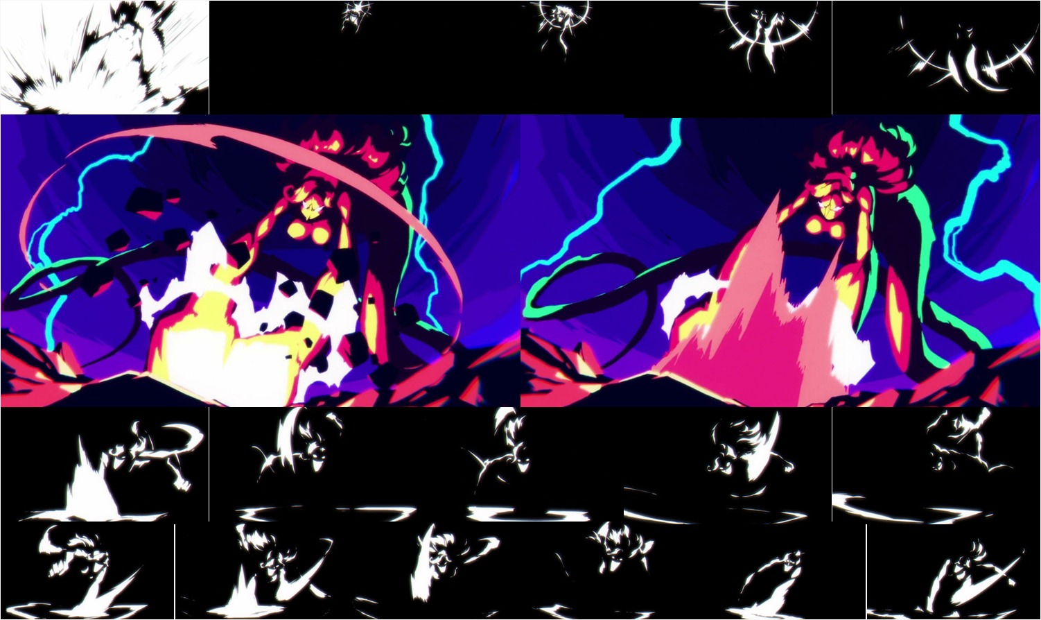 כל הפריימים המטורפים האלה עוברים בתוך כשנייה וחצי בפרק עצמו, שזה מטורף לגמרי, ודי מזכיר את עבודתו של צ'נסארד על פרק 1062. ההבדל, עם זאת, הוא שמיטשל בבירור ניסה לקחת את רמת העיוות והמוזרות של הפריימים שלו לקיצון הכי גדול שהוא יכל, והתוצאה היא שכציורים בודדים, הפריימים נראים פחות יפים מאלה של צ'נסארד בקטע שציינתי קודם מהקרב של זורו. עם זאת, כשהם מקובצים ככה יחד הם נראים מטורף לדעתי, וכשהם מתנגנים בתנועה – שוב, כפי שאנימציה נועדה שייצפו בה – הם עובדים מצויין, ומוכרים היטב את תחושת העוצמה של המתקפה של לואו והנזק הפנימי שהוא גורם לגופה של ביג מאם.