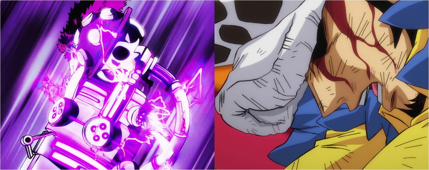 לאחר סיום סצנת הוואן שוט המטורפת של לואו, קיד חוזר – ומכה את ביג מאם עם זרוע המתכת שלו, בקטע אנימציה נוסף שנעשה על-ידי הנרי, יחד עם אנימציה משנית מג'וני, שכבר דיברנו עליו בנוגע לאקשן הקצר של לופי וקאידו מהפרק. בנוסף, גם הקטע הזה וגם הקטע של לואו משתגר לפניו עברו תיקוני איור כבדים מקיטאזאקי, דבר שמורגש מאוד דרך סגנון האיור עם קווי המתאר המאוד עבים שהוא מצייר, אז רק רציתי לציין את זה. אה, ועבר קצת זמן מאז האימפקט פריימס האחרונים שקיבלנו, אז קבלו כמה שהנרי צייר עבור האגרופים של קיד: